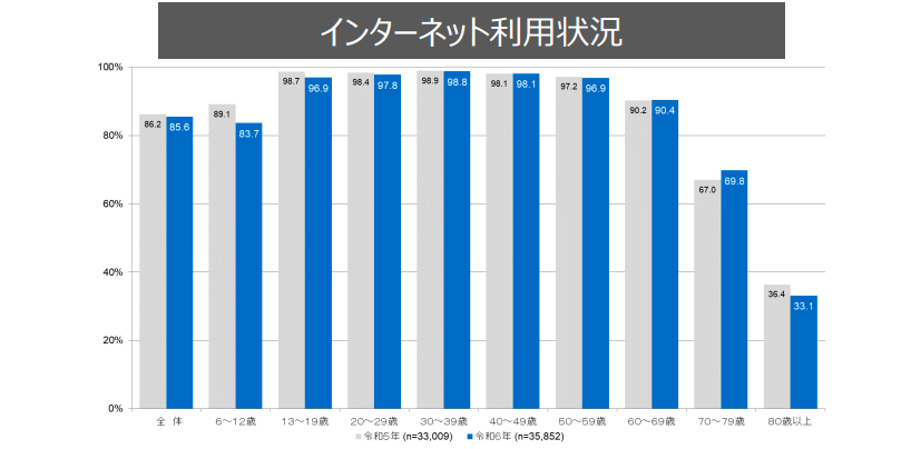 総務省の「令和6年通信利用動向調査」によると、個人のインターネットの利用率は全体で85.6%に達しており、13歳から69歳の個人利用では90%を超える利用率となっています。