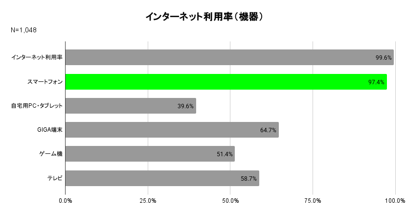 近年の高校生は、SNS・動画・音楽・オンライン授業など、スマホを通して多様なデジタル体験をしています。こども家庭庁が行った令和5年に行った調査によると、高校生のインターネット利用率は99.6%、スマホ所有率は97.4%でした。